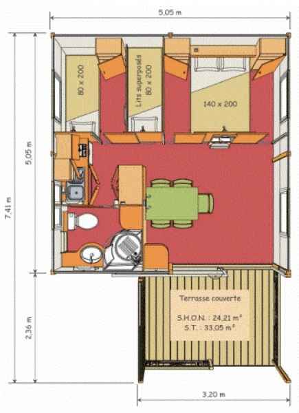2 chambres séparées (lit de 140x200 cm et 3 lits de 80x200 cm) Les draps et les taies d’oreiller ne sont pas fournis, 5 couettes, coin séjour avec table et 5 chaises, banquette 2/3, télévision satellite. Coin cuisine, évier, frigo-congélateur, table de cuisson, four micro-onde, cafetière électrique, vaisselle et ustensiles de cuisine. Salle d'eau, lavabo, douche, wc. Terrasse couverte avec salon de jardin avec parasol.